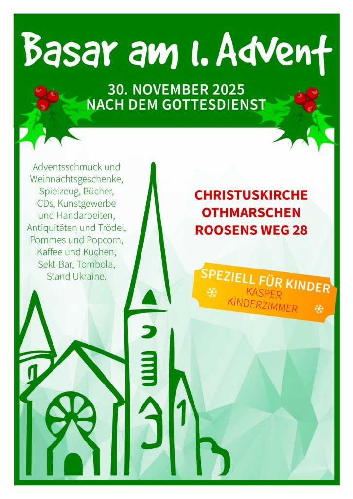 Der Basar lädt zum Verweilen ein, es wird wieder ein „Kinderzimmer“ geben, der Kinderchor singt und mit ein bisschen Glück ziehen Sie bei der Tombola einen wertvollen Preis. Wir laden Sie alle zum Kaufen und Spenden ein, damit wir mit dem Erlös des Basars auch anderen helfen können, die es nötig haben. Ungefähr die Hälfte des Erlöses bleibt in der Gemeinde, mit der anderen Hälfte unterstützen wir ausgesuchte Projekte. Am 1. Advent, dem 30.11.2025 nach dem Gottesdienst geht es los.