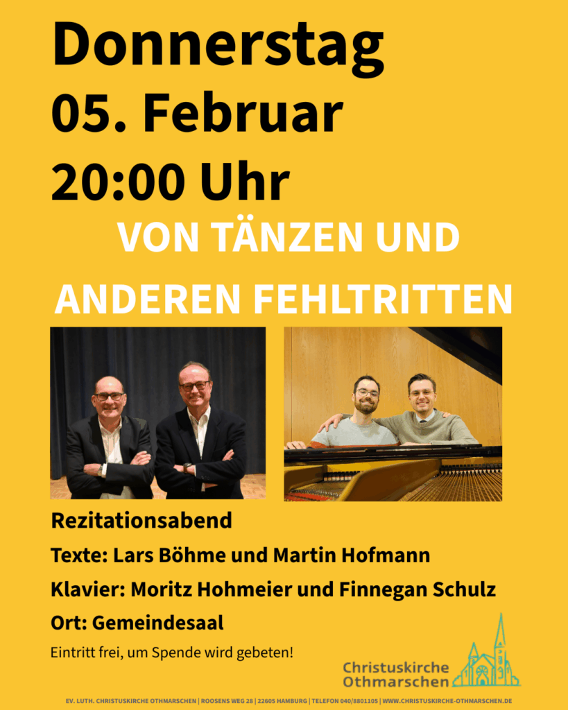 Eins, zwei, drei im Sauseschritt – und der Förderverein tanzt mit. Wir freuen uns auf einen neuen Rezitationsabend am Donnerstag, dem 5. Februar 2026 um 20:00 Uhr im Gemeindesaal. Im Rahmen der Vortragsreihe „Für ein buntes Gemeindeleben!“ präsentieren Lars Böhme und Martin Hofmann ihr Programm „Von Tänzen und anderen Fehltritten“. Texte von Kurt Tucholsky und Joachim Ringelnatz u.a., und Moritz Hohmeier erhitzt die Gemüter mit seinem virtuosen Klavierspiel. Da werden alle ordentlich in Schwung kommen. Bei so vielen Tänzen werden dringend weitere klavierspielende Hände benötigt: Finnegan Schulz, Kantor in Niendorf, wird am Klavier seine Spielkünste zum Besten geben. Fehltritte? Kann man sich bei soviel Expertise gar nicht vorstellen. Um es mit Ringelnatz zu sagen: